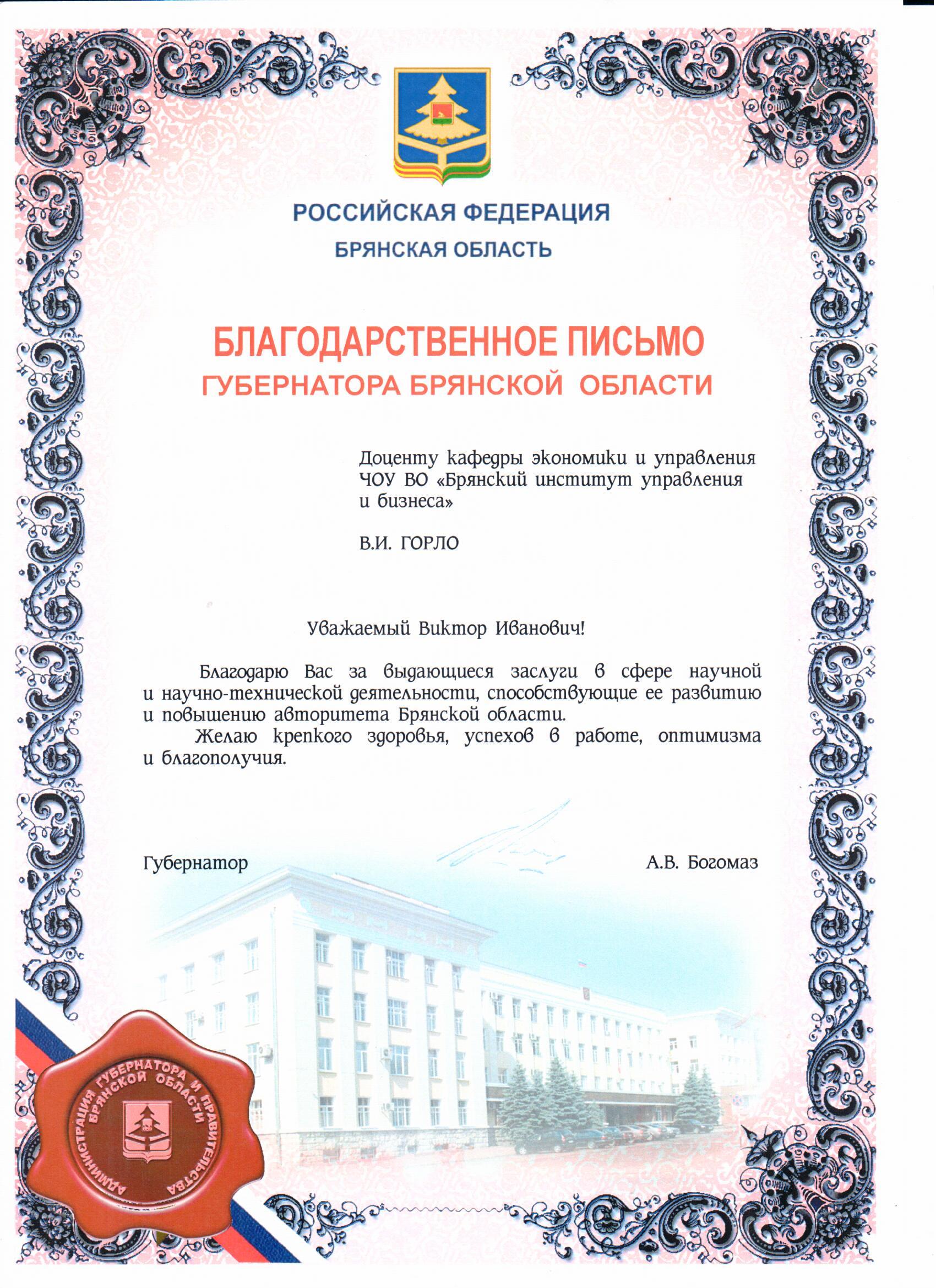 Доцент кафедры Экономики и управления, к.э.н. Горло Виктор Иванович награждён Благодарственным письмом Губернатора Брянской области за выдающиеся заслуги в сфере научной и научно-технической деятельности, способствующие её развитию и повышению авторитета Брянской области.