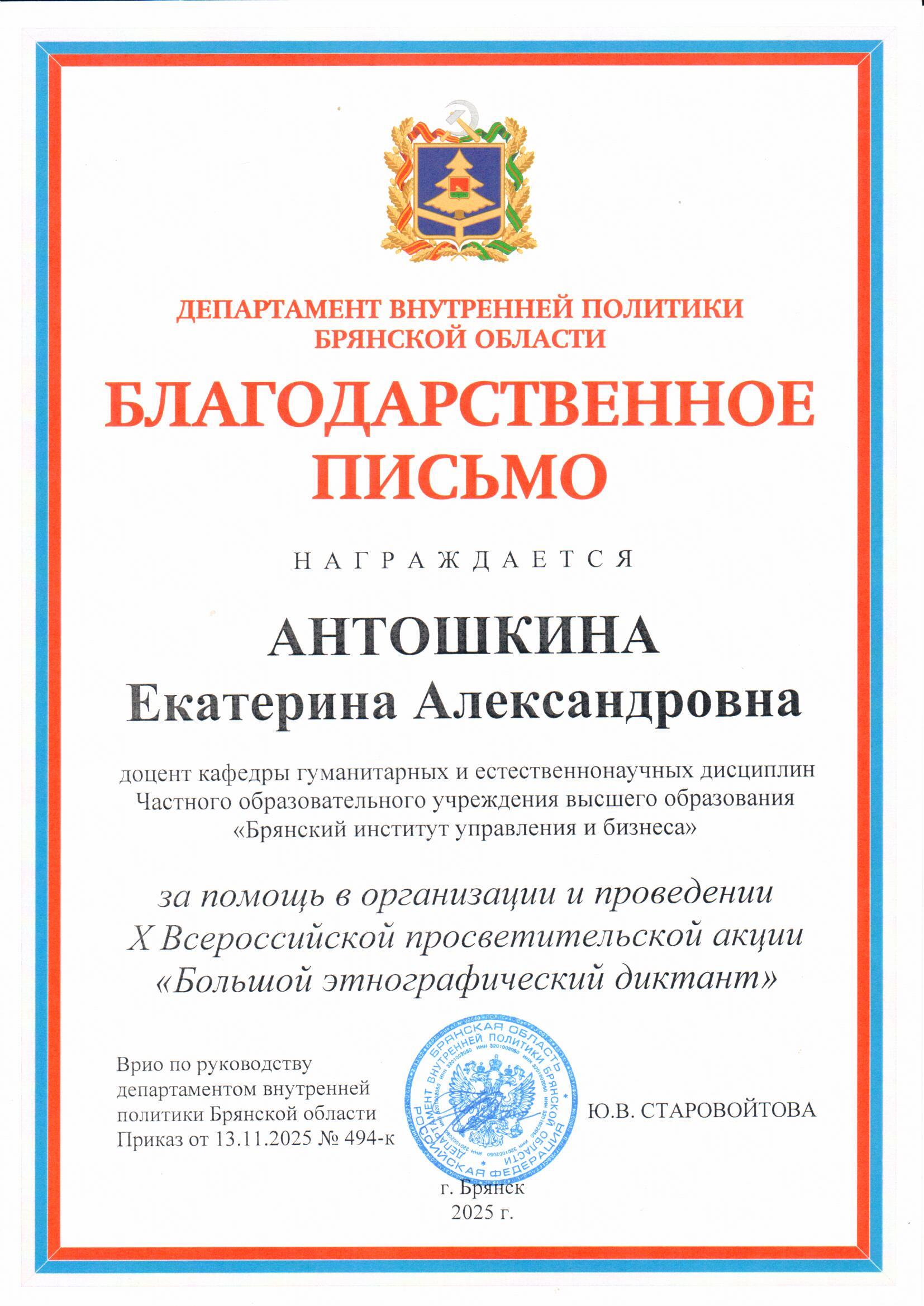 Антошкина Екатерина Александровна, доцент кафедры ГиЕНД награждена Благодарственным письмом Департамента внутренней политики Брянской области за помощь в организации и проведении Х Всероссийской просветительской акции “Большой этнографический диктант”.